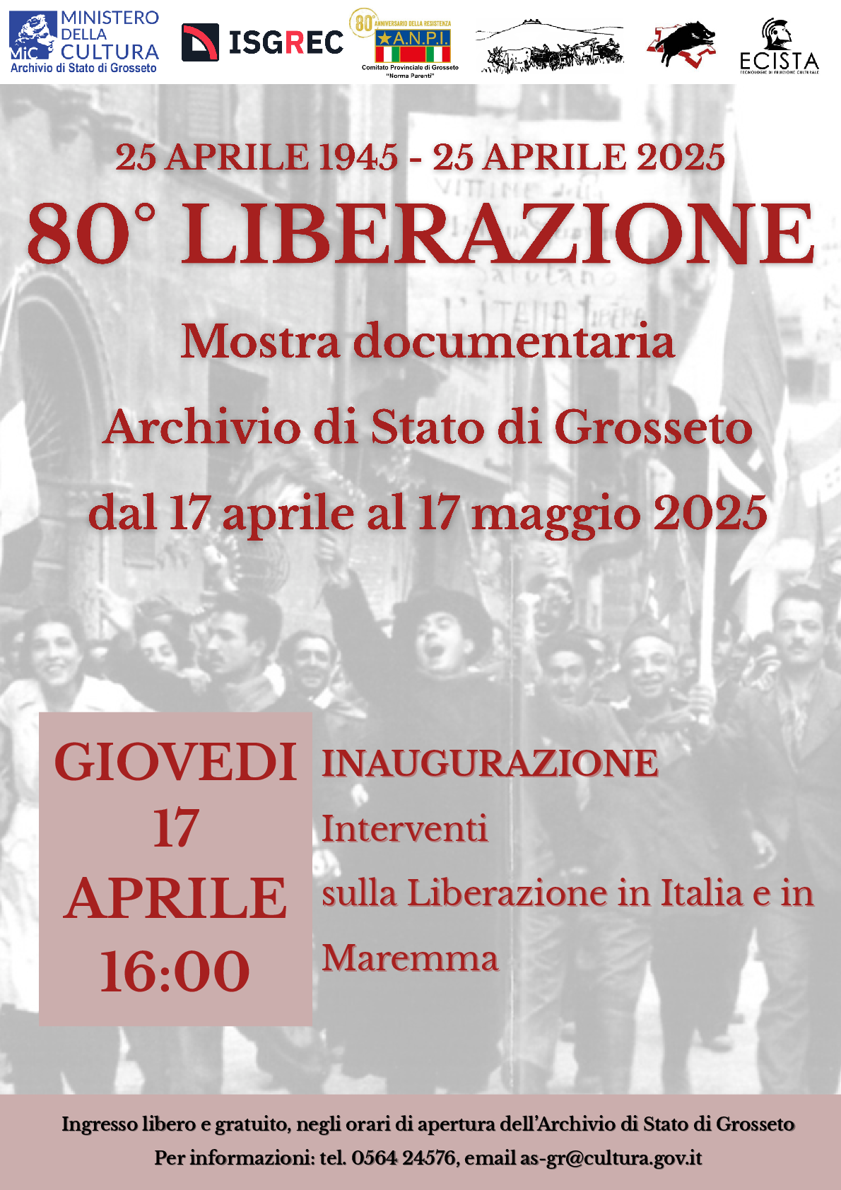 Per celebrare l'80° anniversario della Liberazione italiana, l’Archivio di Stato di Grosseto, in collaborazione con l’Istituto Storico grossetano della Resistenza e dell’Età contemporanea (ISGREC) e ANPI Comitato provinciale di Grosseto, con il Gruppo Tradizioni popolari “Galli Silvestro”, il Circolo Filatelico Numismatico Maremmano ed Ecista, propone una mostra di documenti archivistici e di altri oggetti provenienti da collezioni private, testimonianze del lungo e difficile periodo della Liberazione che, anche in Maremma, restano a memoria delle tante vite sacrificate per la Libertà.