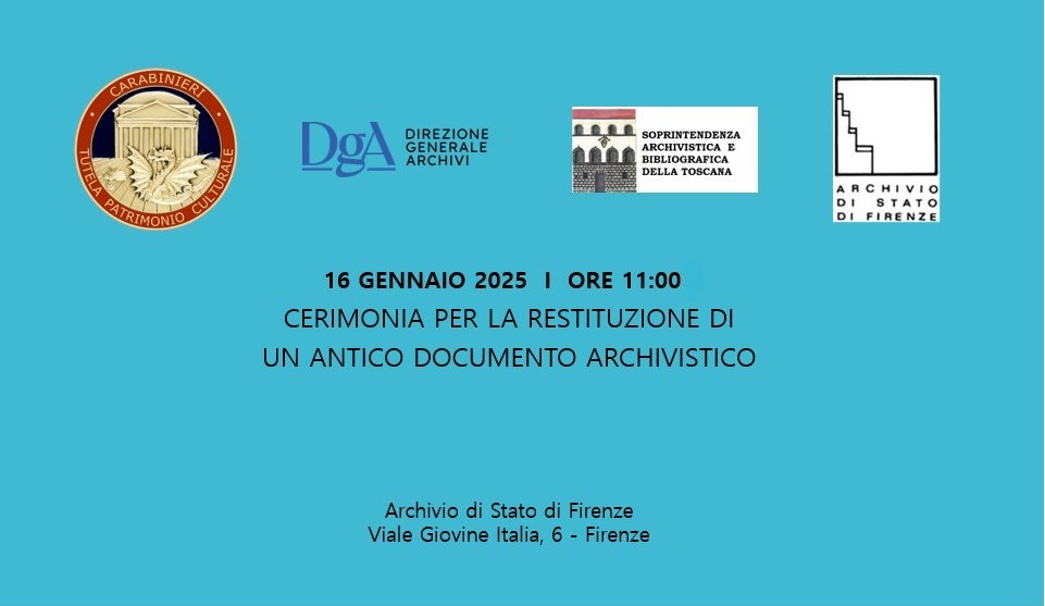Giovedì 16 gennaio 2025, alle ore 11:00, presso l'Archivio di Stato di Firenze, si terrà la cerimonia di restituzione di un volume miscellaneo riconducibile al Fondo Mannelli alla presenza del Colonello Paolo Befera del Comando Carabinieri Tutela del Patrimonio Culturale, del Direttore Generale Archivi dott. Antonio Tarasco, della Direttrice dell’Archivio di Stato di Firenze dott.ssa Paola d’Orsi, della Soprintendente ai Beni Archivistici e Bibliografici della Toscana dott.ssa Eugenia Valacchi.