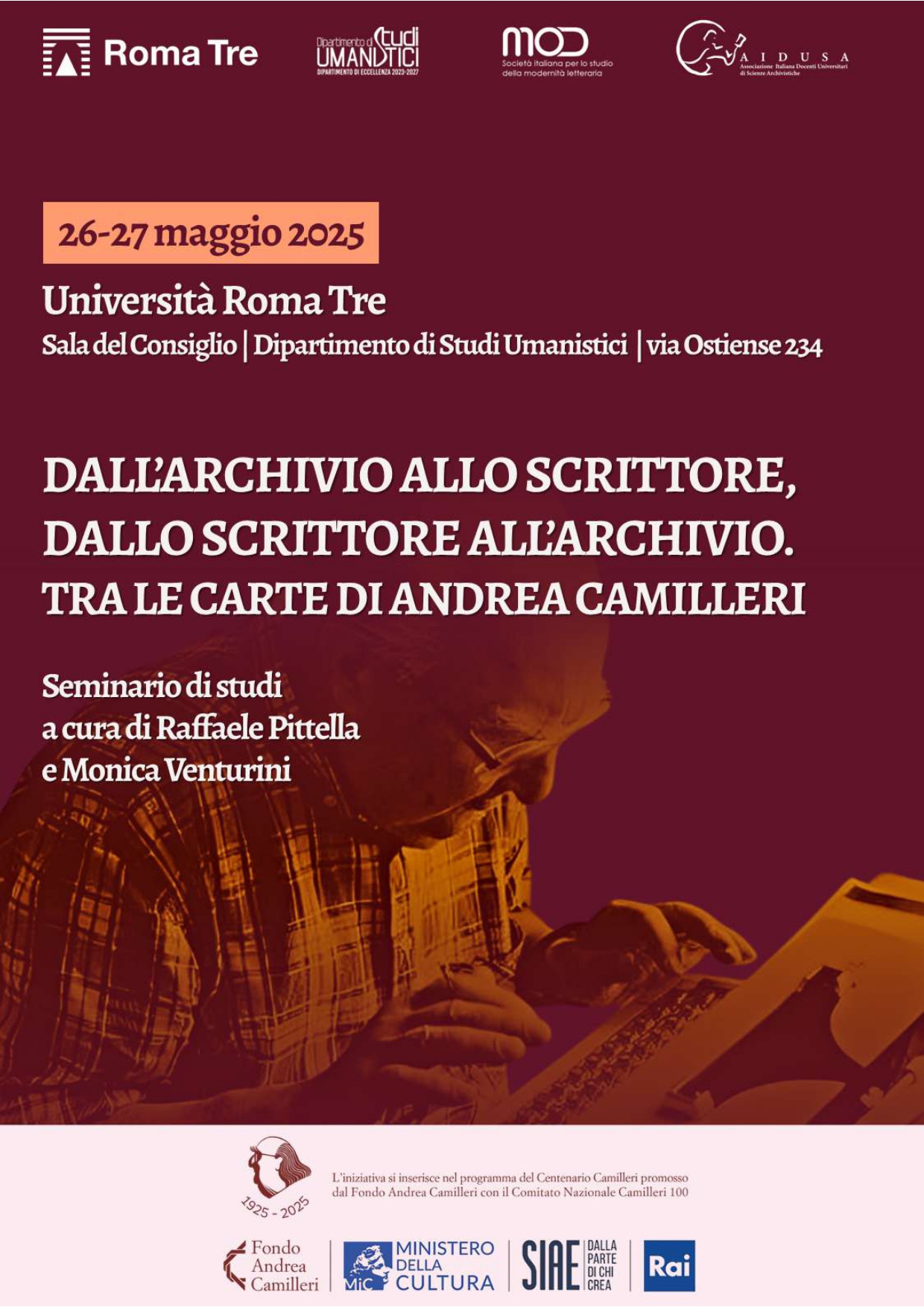 Il 26 e 27 maggio 2025 si terrà, presso la sala del Consiglio dell’Università Roma Tre, il seminario di studi “Dall’archivio allo scrittore, dallo scrittore all’archivio: tra le carte di Camilleri”, a cura di Raffaele Pittella e Monica Venturini.