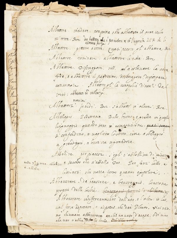 Tra i lemmi commentati in questa carta manoscritta per la preparazione della prima edizione del Vocabolario («Abbattere»; «Abbattersi»; «Abbellagio»; «Abbellire»; «Abbeverare) si segnala il verbo abbellire ‘piacere’, gallicismo frequente nella lirica del Duecento e più volte usato da Dante, del quale qui è citato il verso del Paradiso «secondo che v’abbella» (XXV, 132). Abbellirsi, nel senso di ‘gradire’, è ancora in uso nel fiorentino parlato.