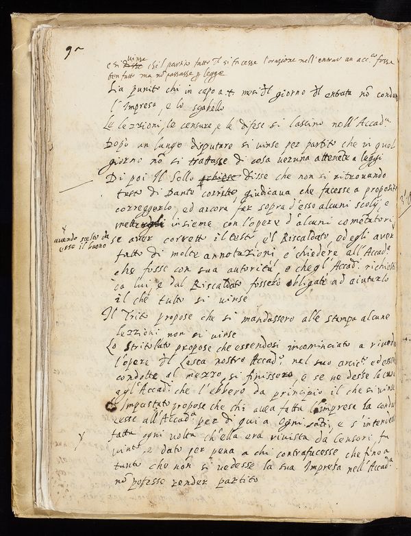 «Di poi il Sollo [Giovambattista Deti] disse che non si ritrovando testo di Dante corretto, giudicava che facesse a proposito correggerlo, ed ancora far sopra d’esso alcuni scolij, e mettergli insieme con l’opere d’alcuni comentatori, avendo scelto da esse il buono, se ave[sse]r corretto il testo; e ’l Riscaldato [Pier Francesco Marinozzi], ed egli aver fatto di molte annotazioni, e chiedere all’Accad[emi]a che fosse con sua autorità, e che gl’Accad[emic]i richiesti da lui, e dal Riscaldato fossero obbligati ad aiutarlo; il che tutto si vinse».