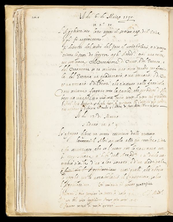 L’immagine mostra la prima attestazione dell’inizio dei lavori del Vocabolario degli Accademici della Crusca che sarà poi stampato a Venezia, appresso Giovanni Alberti, nel 1612, con dedica a Concino Concini, favorito della regina di Francia Maria de’ Medici. Il Vocabolario nacque da un’idea del filologo e teorico della lingua Lionardo Salviati (1539-1589), secondo le teorie enunciate nei suoi Avvertimenti della lingua sopra ’l Decamerone (1584), e si fondava, accanto a volgarizzamenti e a testi di carattere pratico, sullo spoglio dei testi del Trecento fiorentino (in particolare Dante, Petrarca e Boccaccio), ma con inclusione di vari autori successivi (tra i quali Lorenzo de’ Medici, Francesco Berni, Niccolò Machiavelli), anche non toscani (Pietro Bembo, Ludovico Ariosto). L’opera fu realizzata da un gruppo di Accademici in poco più di vent’anni tra lavoro lessicografico, preparazione per la stampa e pubblicazione. Nonostante le dispute che si accesero sul criterio adottato nella scelta delle opere da utilizzare, il Vocabolario della Crusca divenne il principale strumento di riferimento per l’uso scritto dell’italiano. L’edizione si componeva di 25.056 voci.
