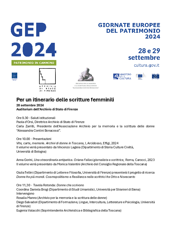Sabato 28 settembre 2024, presso l'Auditorium dell'Archivio di Stato di Firenze, in occasione delle Giornate Europee del Patrimonio 2024, si terrà una tavola rotonda dal titolo "Donne che scrivono" alla quale parteciperà la nostra Soprintendente Arch. Eugenia Valacchi.