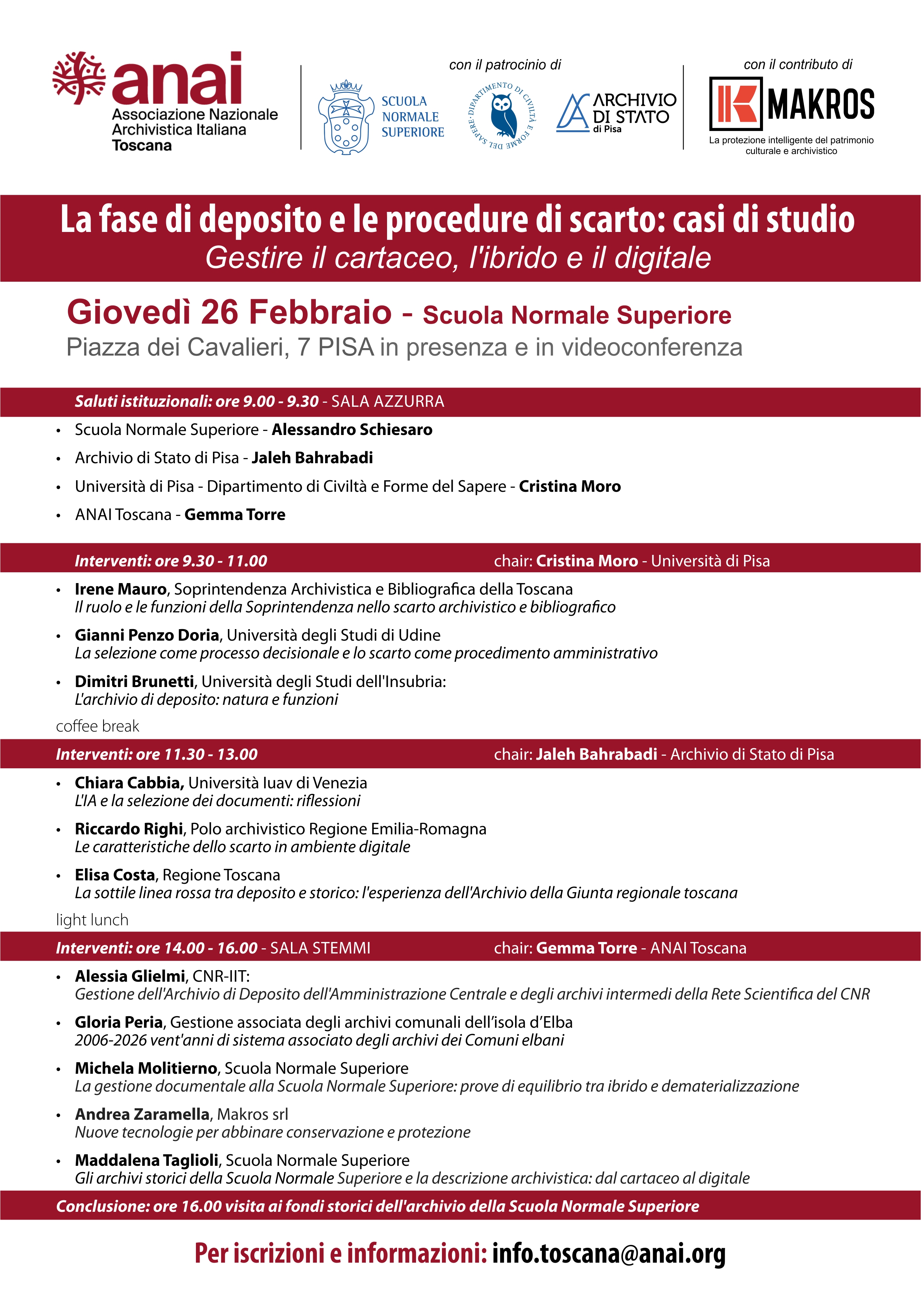 Giovedì 26 febbraio 2026, alle ore 9:00, presso la Scuola Normale Superiore (Piazza dei Cavalieri, 7 - Pisa), si terrà il convegno dal titolo "La fase di deposito e le procedure di scarto: casi di studio. Gestire il cartaceo, l'ibrido e il digitale" a cura di ANAI Toscana.