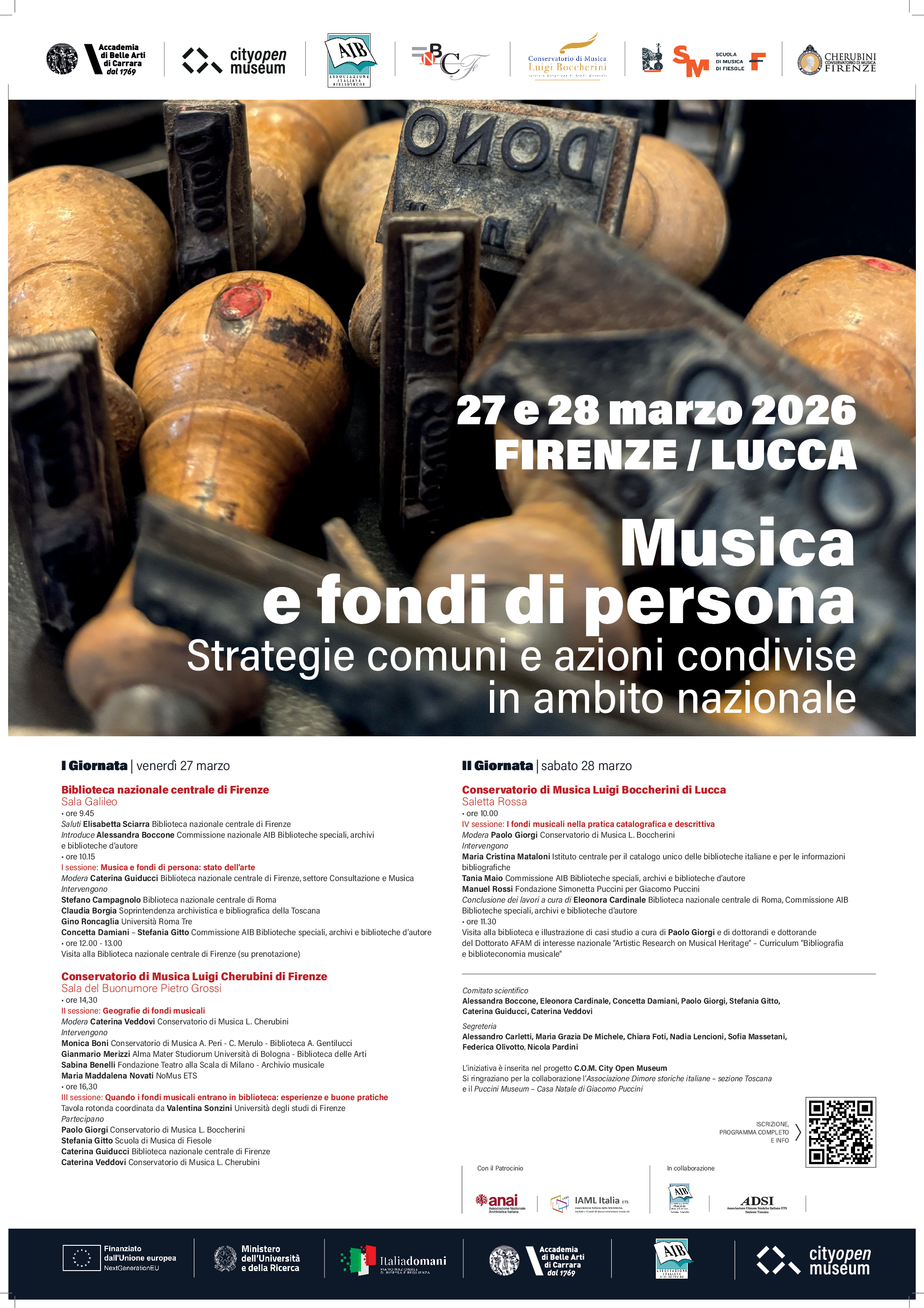 La Commissione nazionale Biblioteche speciali, archivi e biblioteche d’autore, insieme alla Biblioteca nazionale centrale di Firenze, il Conservatorio di musica “Luigi Cherubini” di Firenze, Fondazione Scuola di musica di Fiesole e il Conservatorio di musica “Luigi Boccherini” di Lucca, in collaborazione con AIB Toscana organizza un convegno di studi dedicato ai fondi di personalità musicali nei giorni 27 e 28 marzo 2026 a Firenze e a Lucca.