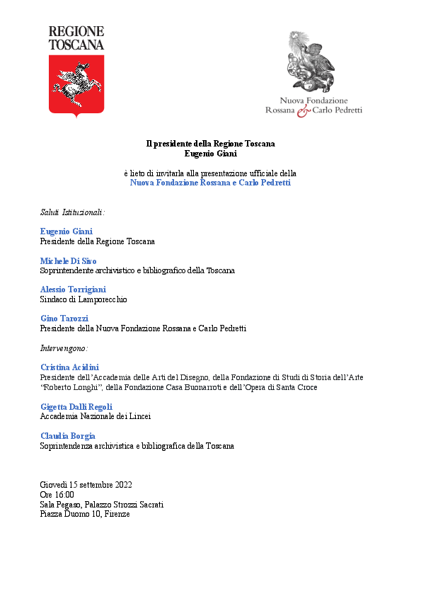 La Soprintendenza archivistica e bibliografica della Toscana partecipa alla presentazione della Nuova Fondazione Rossana e Carlo Pedretti.