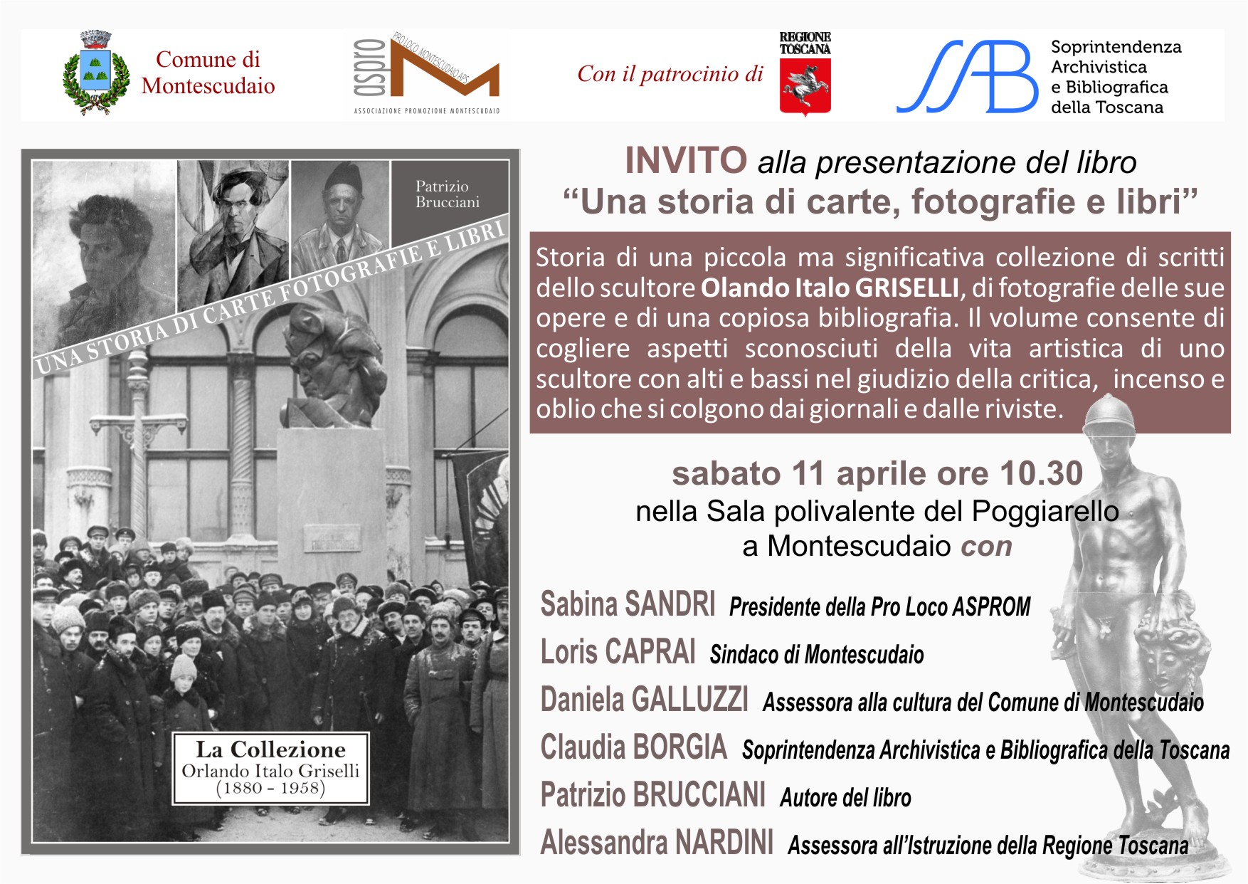 Sabato 11 aprile 2026, alle 10.30, presso la Sala polivalente del Poggiarello, a Montescudaio (PI), si terrà la presentazione del libro di Patrizio Brucciani “Una storia di carte, fotografie e libri – La Collezione Orlando Italo Griselli (1880 – 1958)", collezione dichiarata di interesse storico particolarmente importante dalla Soprintendenza archivistica e bibliografica della Toscana, ai sensi del D.Lgs 42/2004 nel 2024.