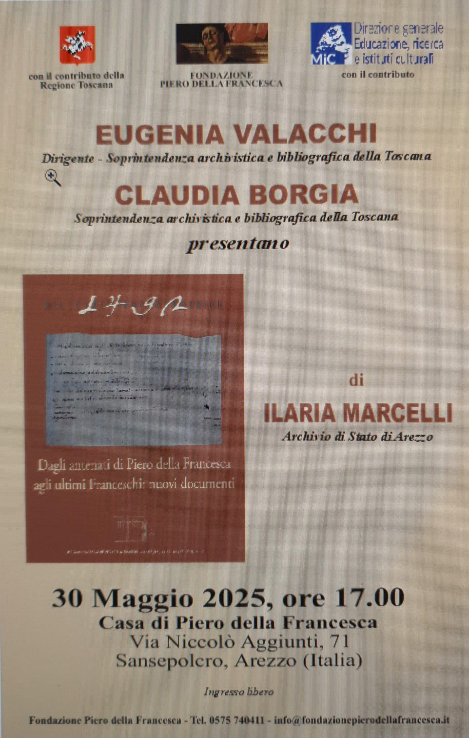 Venerdì 30 maggio 2025, alle ore 17, presso la Casa di Piero della Francesca in via Niccolò Aggiunti 71, Sansepolcro (Arezzo), si terrà l’incontro di presentazione del numero speciale di “1492. Rivista della Fondazione Piero della Francesca”, dedicato a nuove scoperte documentarie sulla famiglia di Piero della Francesca. Il saggio dal titolo “Dagli antenati di Piero della Francesca agli ultimi Franceschi: nuovi documenti” è di Ilaria Marcelli, direttrice dell’Archivio di Stato di Arezzo.